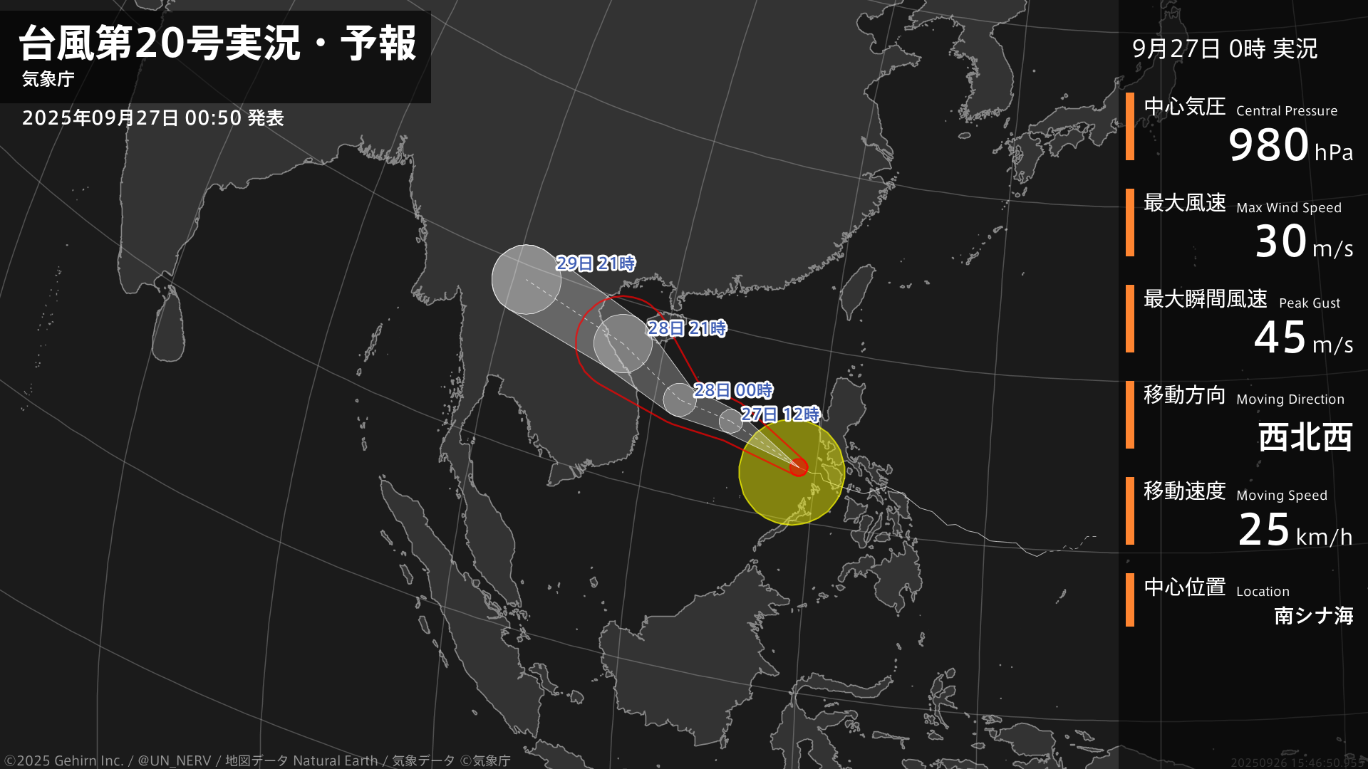 【台風第20号実況・予報 2025年09月27日 00:46】台風第20号(ブアローイ)は、南シナ海を1時間に25キロの速さで西北西に進んでいます。#台風情報