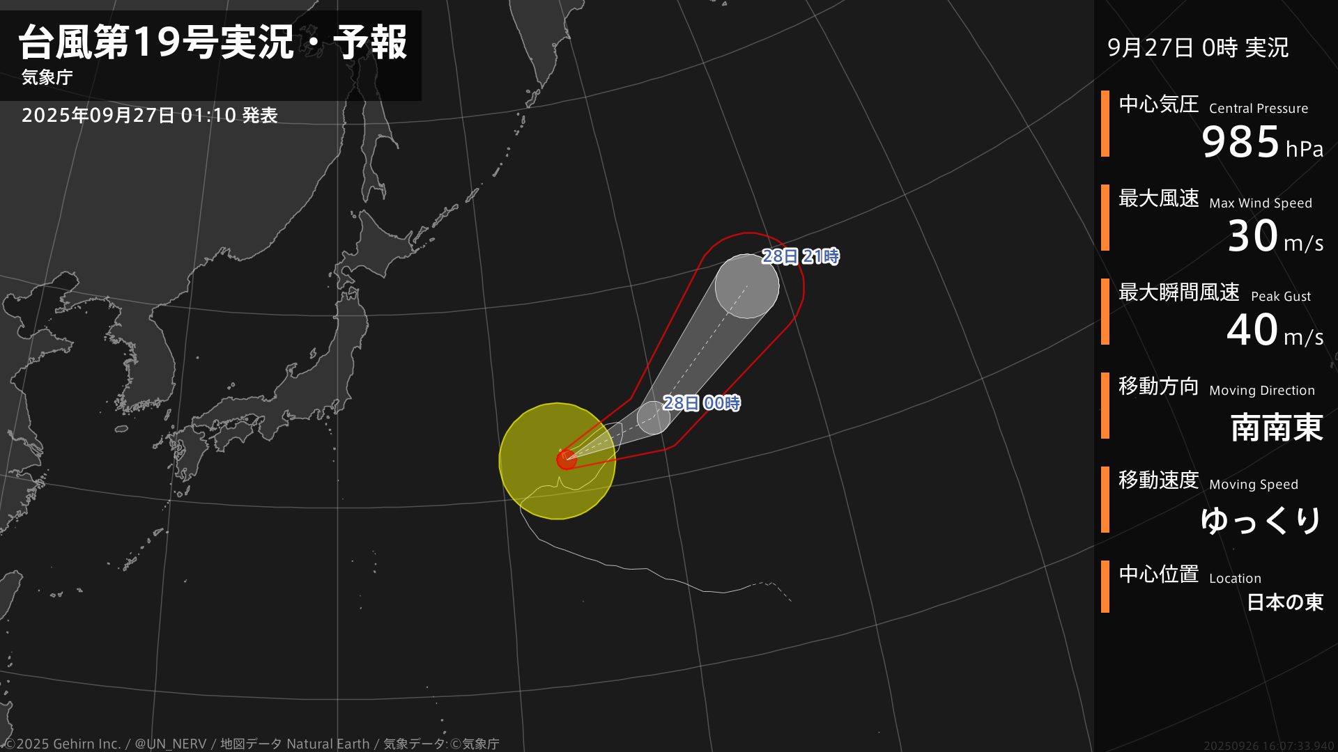 【台風第19号実況・予報 2025年09月27日 01:07】台風第19号(ノグリー)は、日本の東をゆっくりと南南東に進んでいます。#台風情報