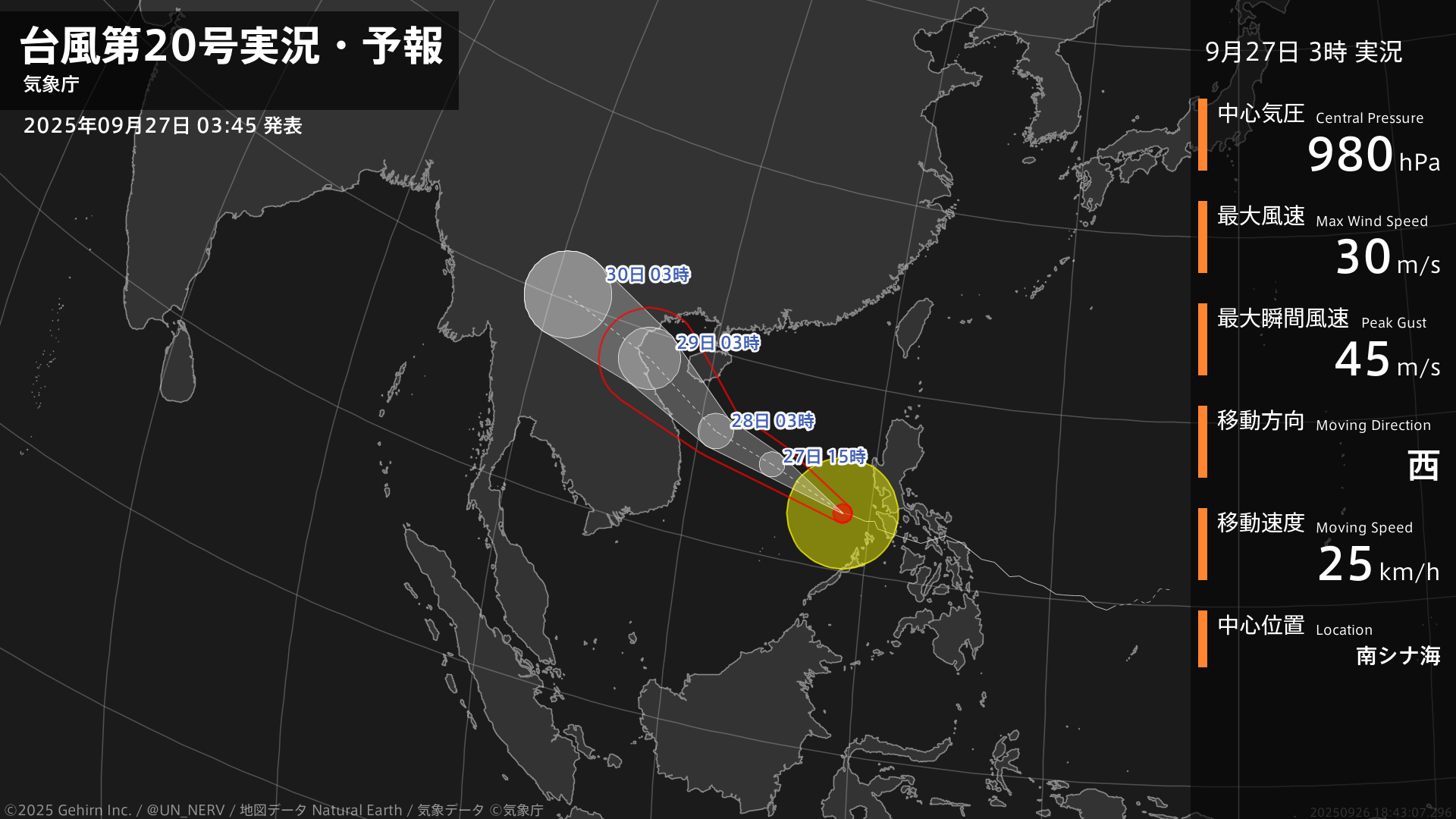 【台風第20号実況・予報 2025年09月27日 03:43】台風第20号(ブアローイ)は、南シナ海を1時間に25キロの速さで西に進んでいます。#台風情報