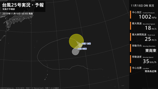 【台風25号実況・予報 2019年11月18日 00:42】台風25号(フンシェン)は、南鳥島近海を1時間に35キロの速さで東南東に進んでいます。#台風情報