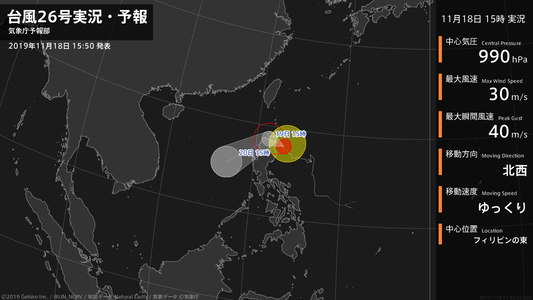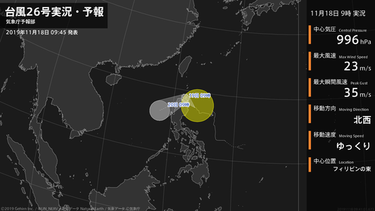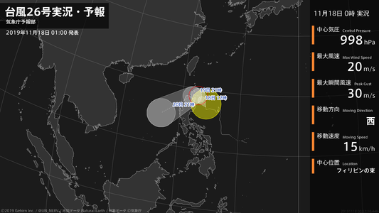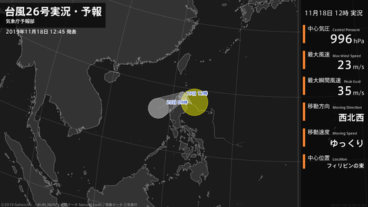 【台風26号実況・予報 2019年11月18日 00:57】台風26号(カルマエギ)は、フィリピンの東を1時間に15キロの速さで西に進んでいます。#台風情報