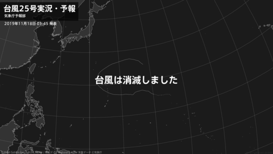 【台風25号実況・予報 2019年11月18日 03:41】台風25号(フンシェン)は熱帯低気圧に変わりました。#台風情報