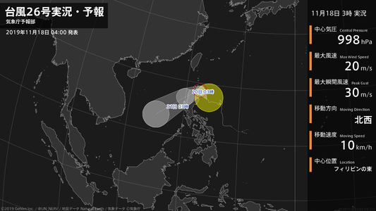 【台風26号実況・予報 2019年11月18日 03:55】台風26号(カルマエギ)は、フィリピンの東を1時間に10キロの速さで北西に進んでいます。#台風情報