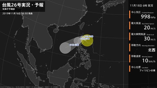 【台風26号実況・予報 2019年11月18日 06:46】台風26号(カルマエギ)は、フィリピンの東を1時間に10キロの速さで北西に進んでいます。#台風情報