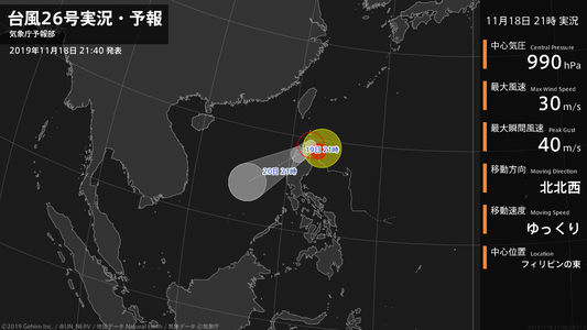 【台風26号実況・予報 2019年11月18日 21:38】台風26号(カルマエギ)は、フィリピンの東をゆっくりと北北西に進んでいます。#台風情報