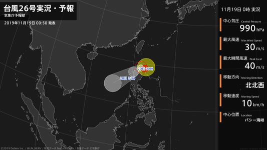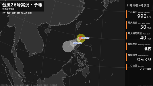 【台風26号実況・予報 2019年11月19日 00:51】台風26号(カルマエギ)は、バシー海峡を1時間に10キロの速さで北北西に進んでいます。#台風情報