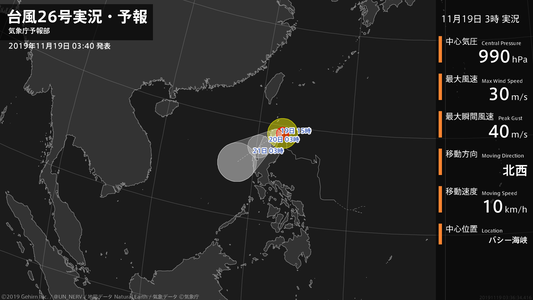 【台風26号実況・予報 2019年11月19日 03:36】台風26号(カルマエギ)は、バシー海峡を1時間に10キロの速さで北西に進んでいます。#台風情報