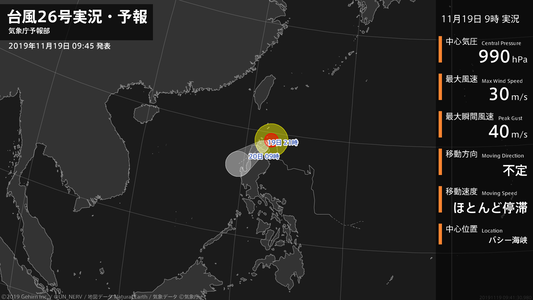 【台風26号実況・予報 2019年11月19日 09:41】台風26号(カルマエギ)は、バシー海峡でほとんど停滞しています。#台風情報