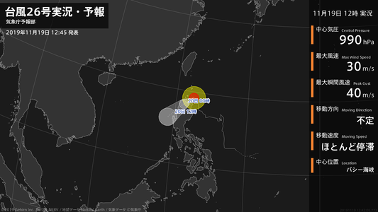 【台風26号実況・予報 2019年11月19日 18:41】台風26号(カルマエギ)は、バシー海峡でほとんど停滞しています。#台風情報