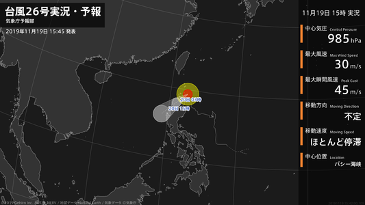 【台風26号実況・予報 2019年11月19日 15:42】台風26号(カルマエギ)は、バシー海峡でほとんど停滞しています。#台風情報