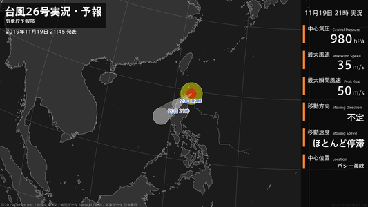 【台風26号実況・予報 2019年11月19日 21:41】強い台風26号(カルマエギ)は、バシー海峡でほとんど停滞しています。#台風情報
