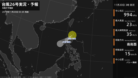 【台風26号実況・予報 2019年11月20日 03:44】台風26号(カルマエギ)は、バシー海峡を1時間に15キロの速さで南南西に進んでいます。#台風情報