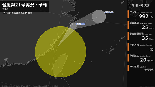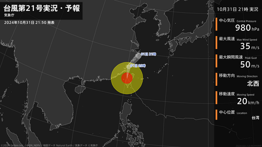 【台風第21号実況・予報 2024年10月31日 21:45】強い台風第21号(コンレイ)は、台湾を1時間に20キロの速さで北西に進んでいます。#台風情報