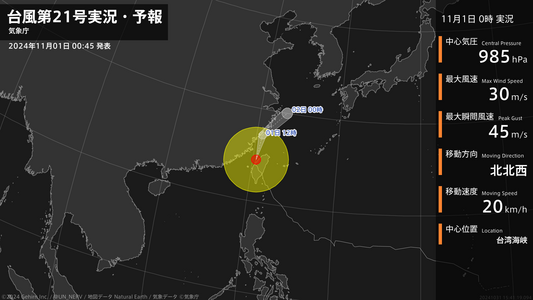 【台風第21号実況・予報 2024年11月01日 00:41】台風第21号(コンレイ)は、台湾海峡を1時間に20キロの速さで北北西に進んでいます。#台風情報
