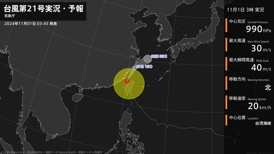 【台風第21号実況・予報 2024年11月01日 03:40】台風第21号(コンレイ)は、台湾海峡を1時間に20キロの速さで北に進んでいます。#台風情報