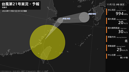 【台風第21号実況・予報 2024年11月01日 09:45】台風第21号(コンレイ)は、東シナ海を1時間に25キロの速さで北に進んでいます。#台風情報