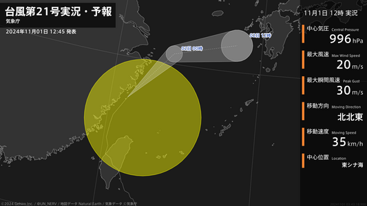 【台風第21号実況・予報 2024年11月01日 12:43】台風第21号(コンレイ)は、東シナ海を1時間に35キロの速さで北北東に進んでいます。#台風情報