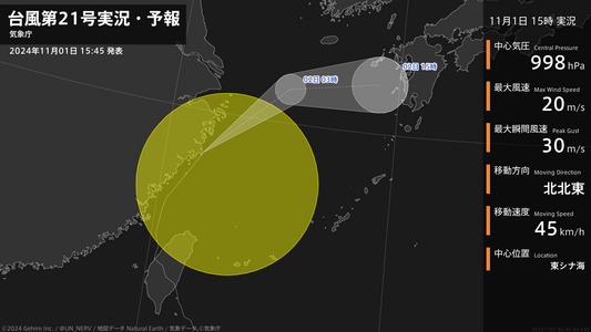 【台風第21号実況・予報 2024年11月01日 15:45】台風第21号(コンレイ)は、東シナ海を1時間に45キロの速さで北北東に進んでいます。#台風情報
