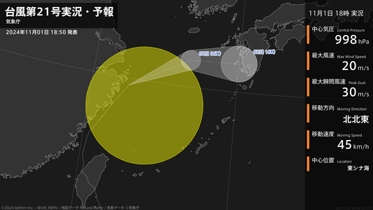 【台風第21号実況・予報 2024年11月01日 18:46】台風第21号(コンレイ)は、東シナ海を1時間に45キロの速さで北北東に進んでいます。#台風情報