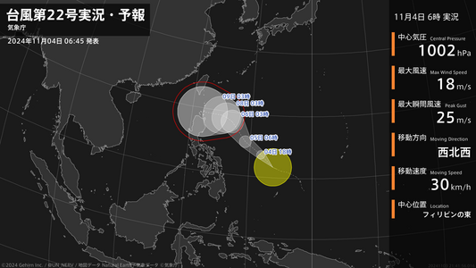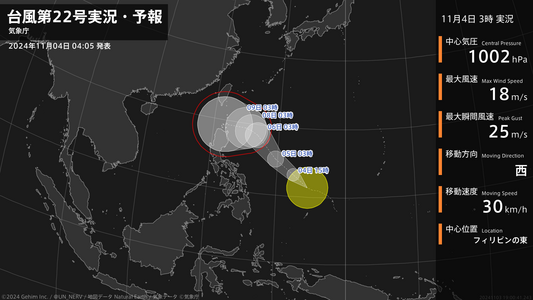 【台風第22号実況・予報 2024年11月04日 06:41】台風第22号(インシン)は、フィリピンの東を1時間に30キロの速さで西北西に進んでいます。#台風情報