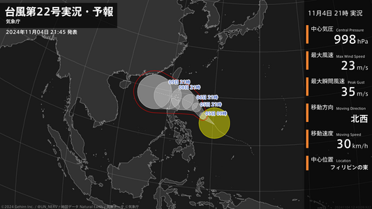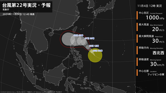 【台風第22号実況・予報 2024年11月04日 21:43】台風第22号(インシン)は、フィリピンの東を1時間に30キロの速さで北西に進んでいます。#台風情報