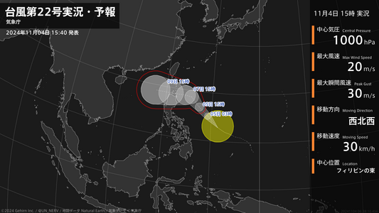 【台風第22号実況・予報 2024年11月04日 15:38】台風第22号(インシン)は、フィリピンの東を1時間に30キロの速さで西北西に進んでいます。#台風情報