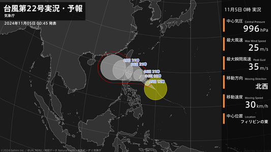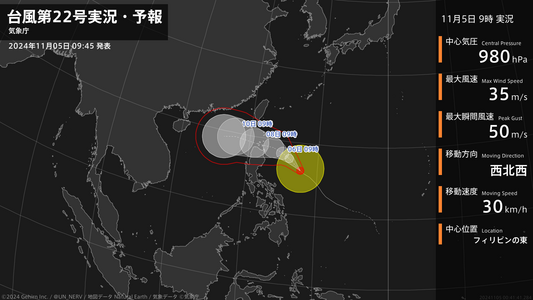 【台風第22号実況・予報 2024年11月05日 00:41】台風第22号(インシン)は、フィリピンの東を1時間に30キロの速さで北西に進んでいます。#台風情報