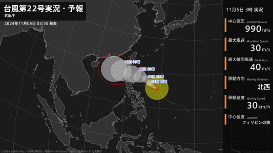 【台風第22号実況・予報 2024年11月05日 03:49】台風第22号(インシン)は、フィリピンの東を1時間に30キロの速さで北西に進んでいます。#台風情報