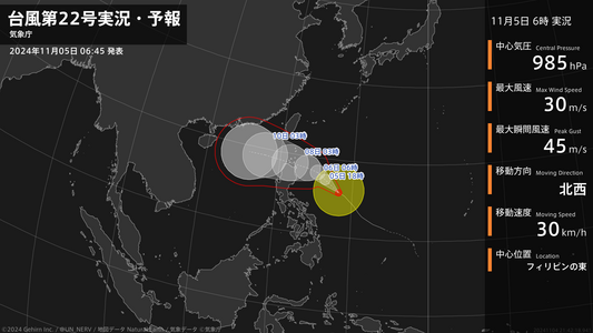 【台風第22号実況・予報 2024年11月05日 06:42】台風第22号(インシン)は、フィリピンの東を1時間に30キロの速さで北西に進んでいます。#台風情報