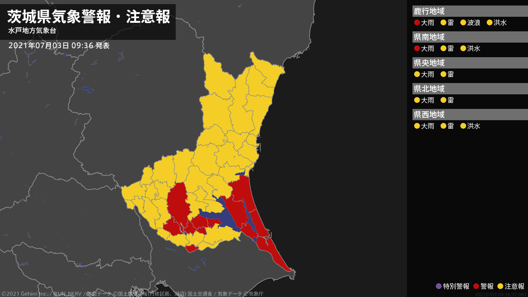 【茨城県 気象警報 2021年07月03日 09:36】南部では、3日昼前まで土砂災害に警戒してください。#気象警報 #気象警報注意報 #茨城県