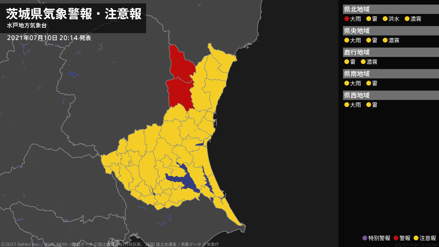 【茨城県 気象警報 2021年07月10日 20:14】北部では、10日夜遅くまで土砂災害に警戒してください。#気象警報 #気象警報注意報 #茨城県