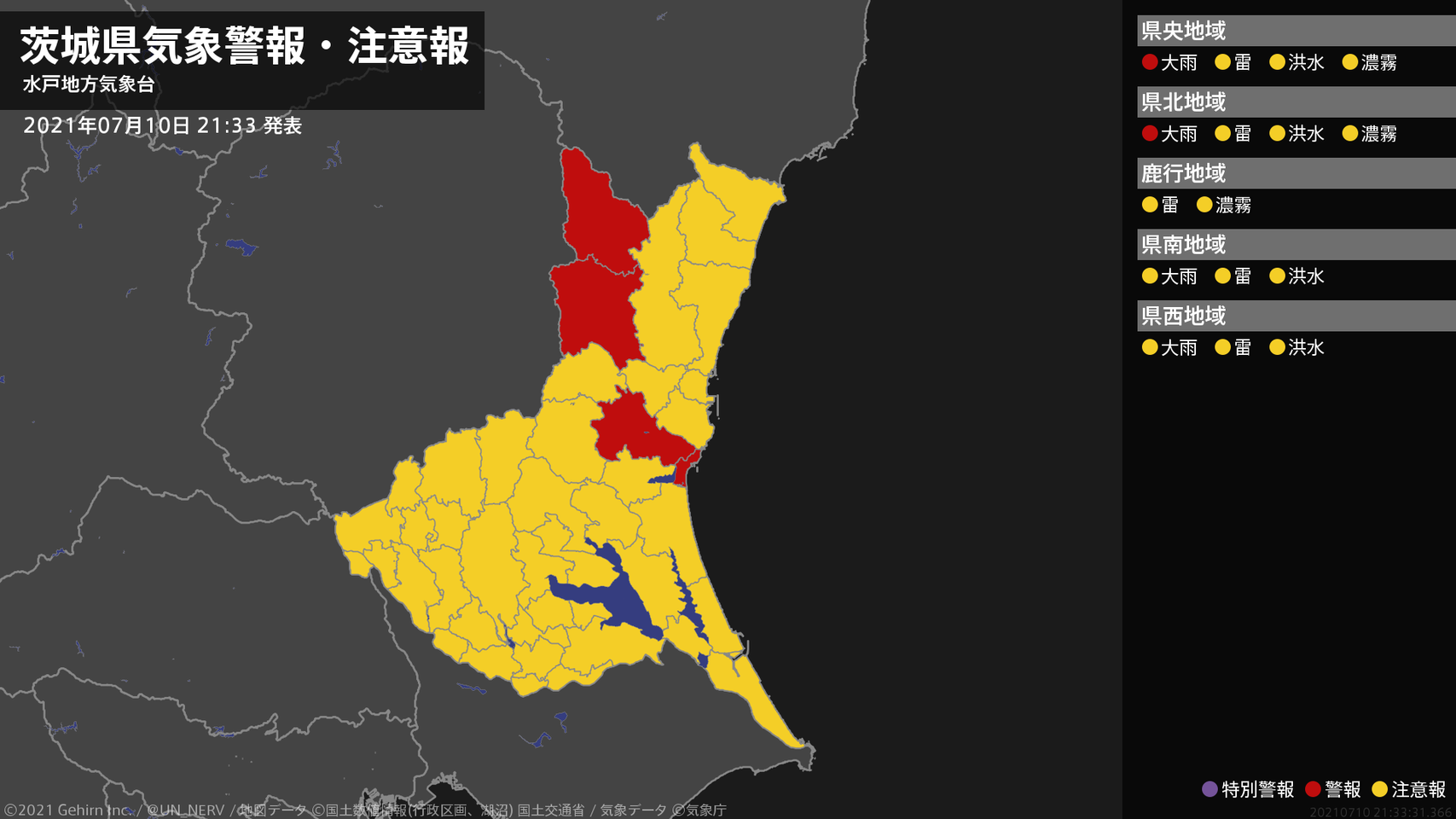 【茨城県 気象警報 2021年07月10日 21:33】北部では、10日夜遅くまで土砂災害や低い土地の浸水に警戒してください。#気象警報 #気象警報注意報 #茨城県
