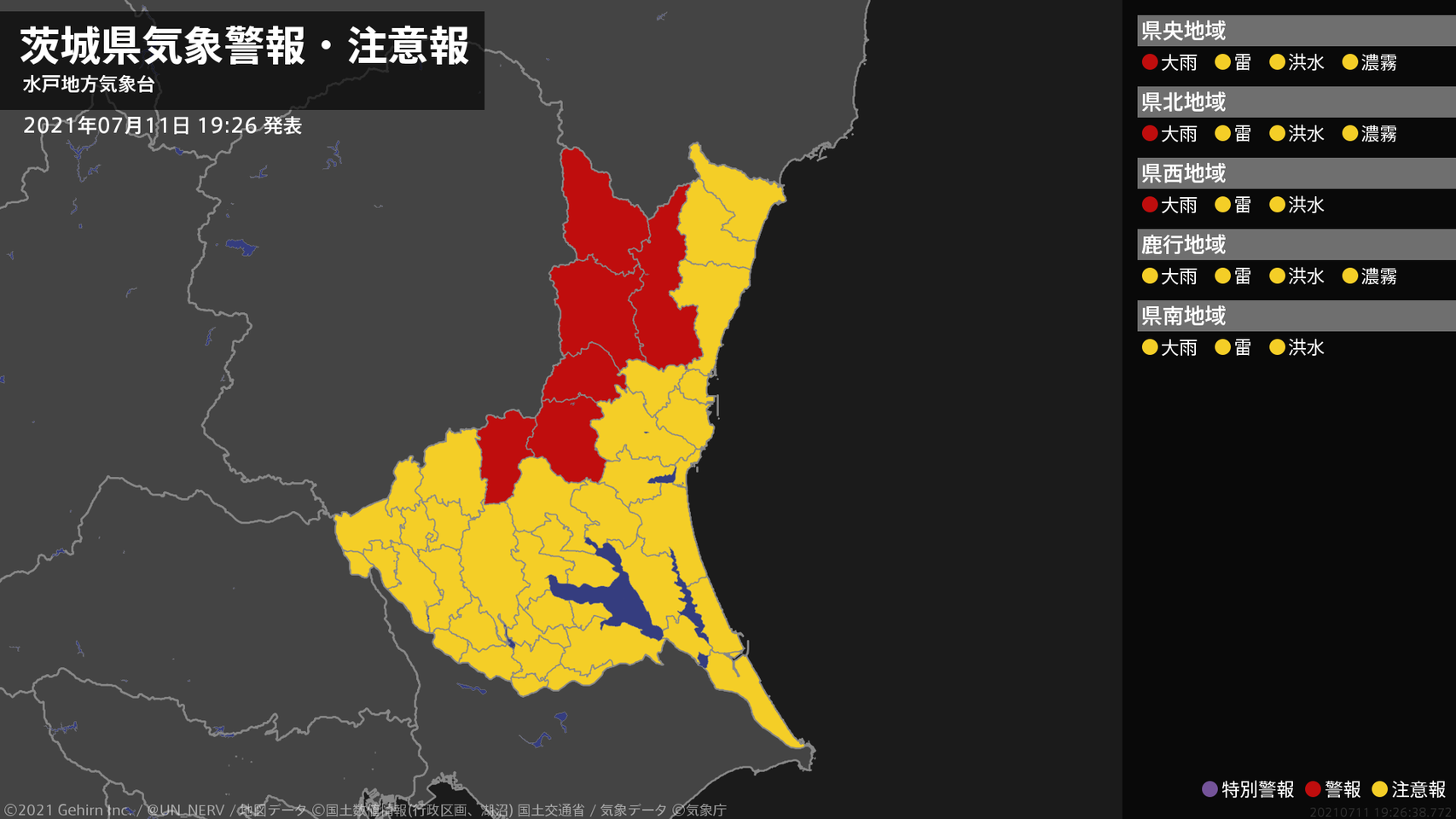 【茨城県 気象警報 2021年07月11日 19:26】茨城県では、11日夜遅くまで土砂災害に警戒してください。#気象警報 #気象警報注意報 #茨城県