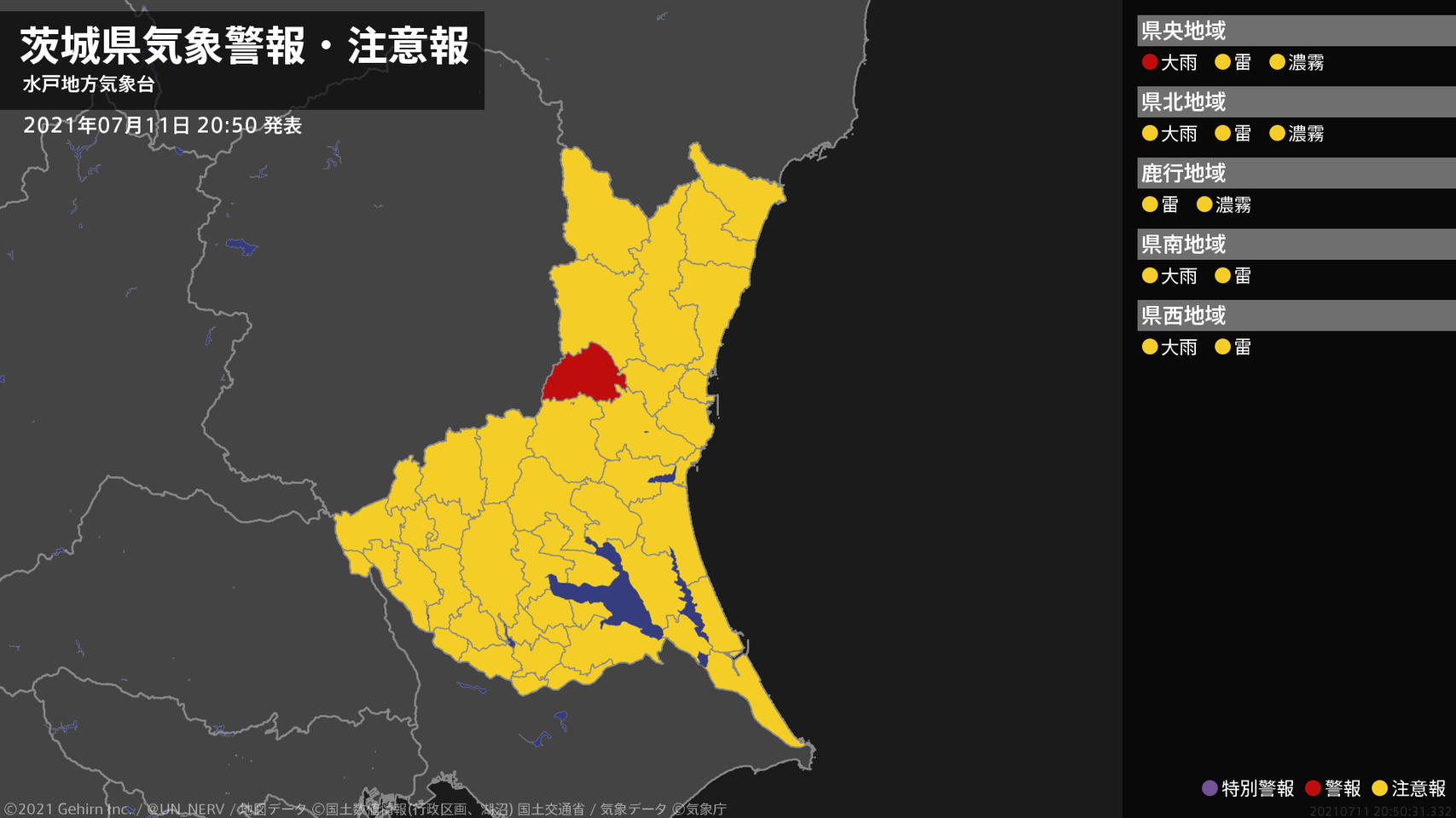 【茨城県 気象警報 2021年07月11日 20:50】北部では、11日夜遅くまで土砂災害に警戒してください。#気象警報 #気象警報注意報 #茨城県