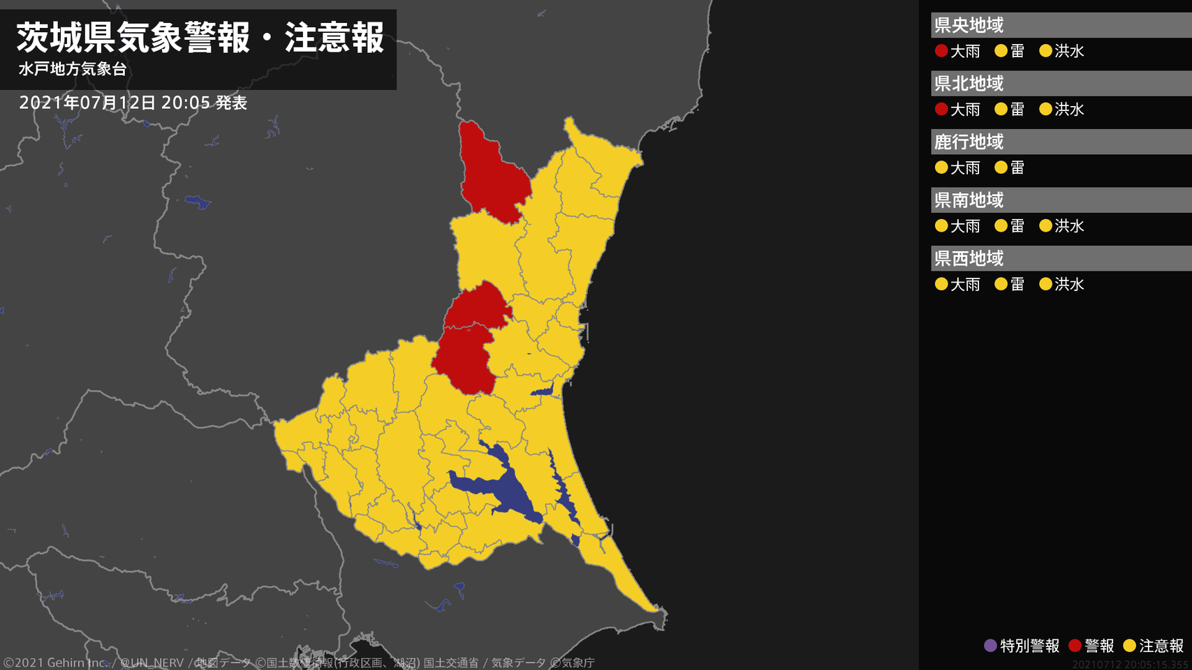【茨城県 気象警報 2021年07月12日 20:05】北部では、12日夜遅くまで土砂災害に警戒してください。#気象警報 #気象警報注意報 #茨城県