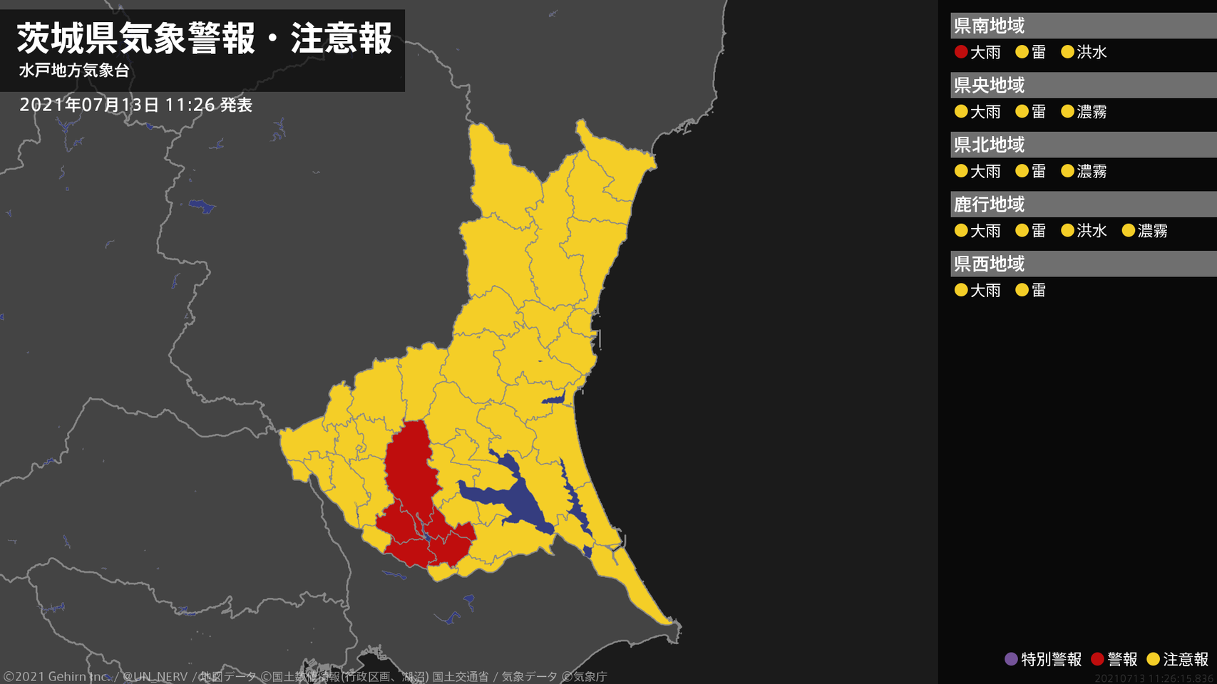 【茨城県 気象警報 2021年07月13日 11:26】南部では、13日夕方まで土砂災害に警戒してください。#気象警報 #気象警報注意報 #茨城県