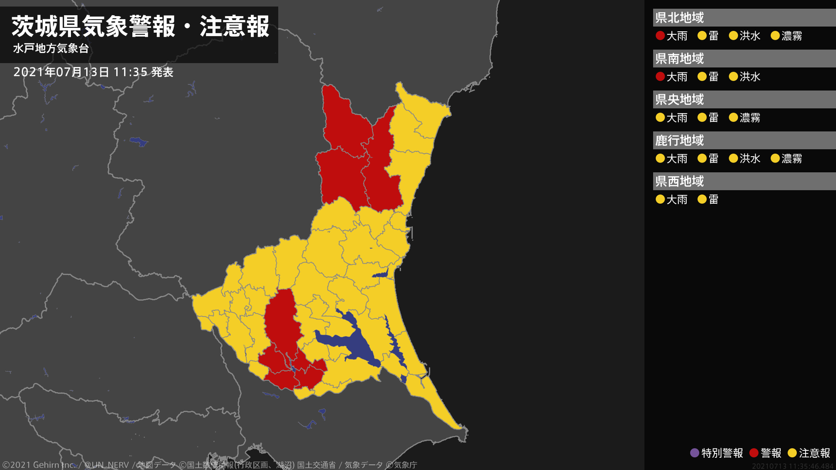 【茨城県 気象警報 2021年07月13日 11:35】茨城県では、13日夕方まで土砂災害に警戒してください。#気象警報 #気象警報注意報 #茨城県