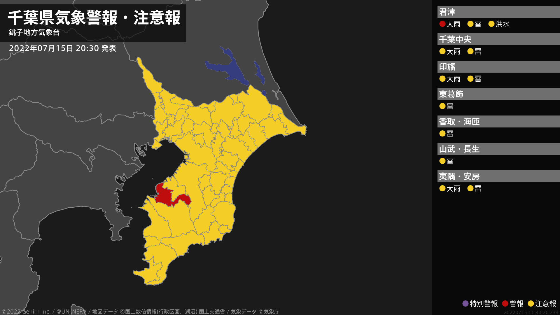 【千葉県 気象警報 2022年07月15日 20:30】南部では、15日夜遅くまで土砂災害に警戒してください。#気象警報 #気象警報注意報 #千葉県