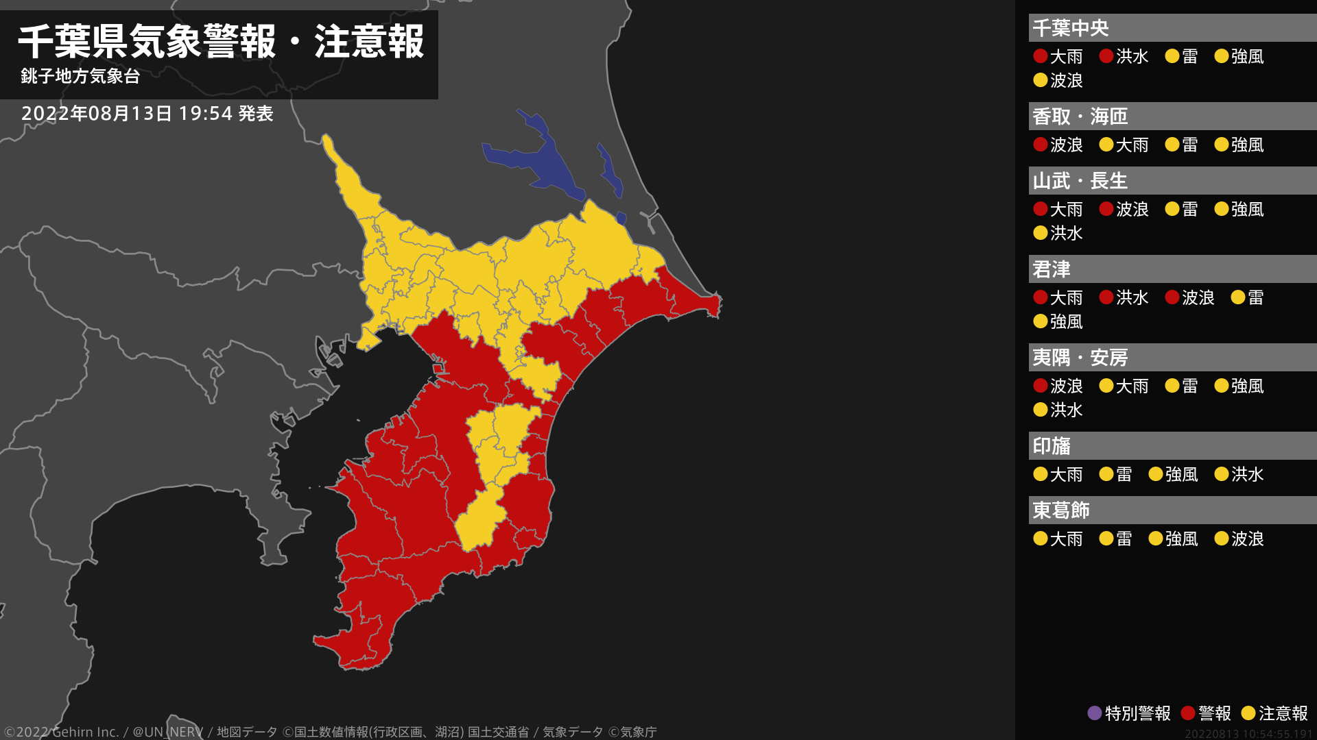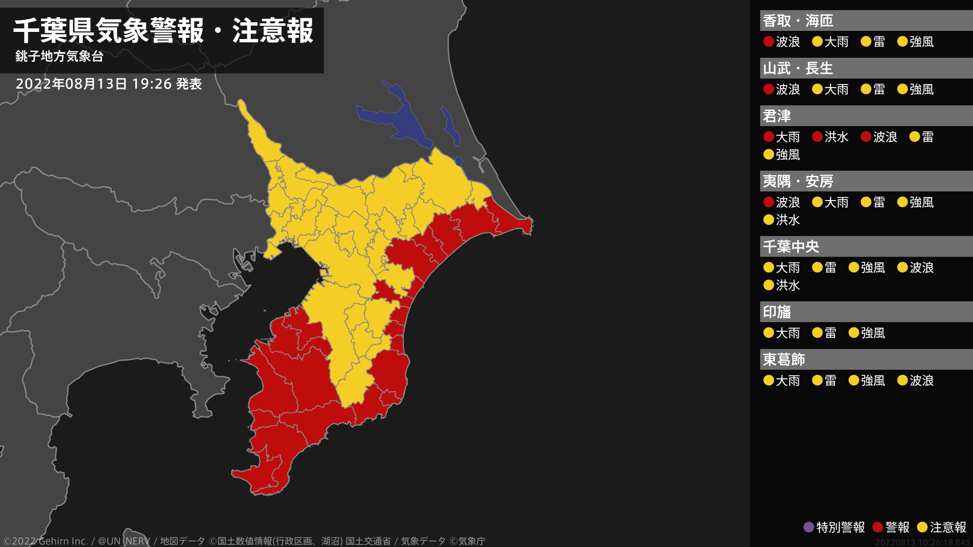 【千葉県 気象警報 2022年08月13日 19:26】南部では、13日夜遅くまで低い土地の浸水や河川の増水に警戒してください。北東部、南部では、13日夜遅くまで高波に警戒してください。#気象警報 #気象警報注意報 #千葉県