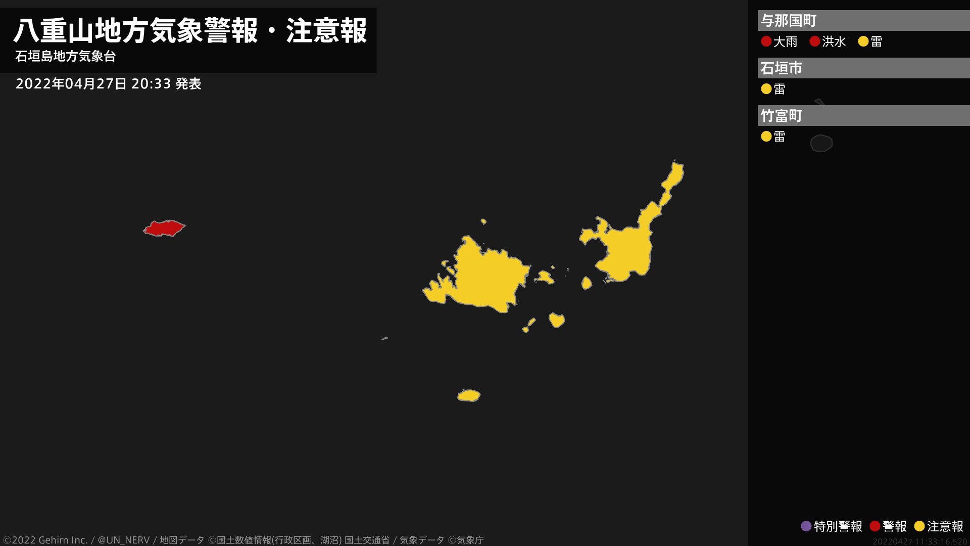 【八重山地方 気象警報 2022年04月27日 20:33】与那国島地方では、27日夜遅くまで低い土地の浸水や河川の増水に警戒してください。#気象警報 #気象警報注意報 #八重山地方