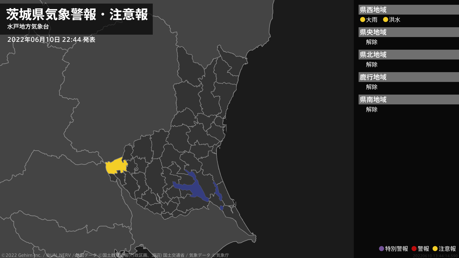 【茨城県 気象警報(解除) 2022年06月10日 22:44】茨城県に発表されていた気象警報はすべて解除されました。南部では、10日夜遅くまで低い土地の浸水や河川の増水に注意してください。#気象警報 #茨城県