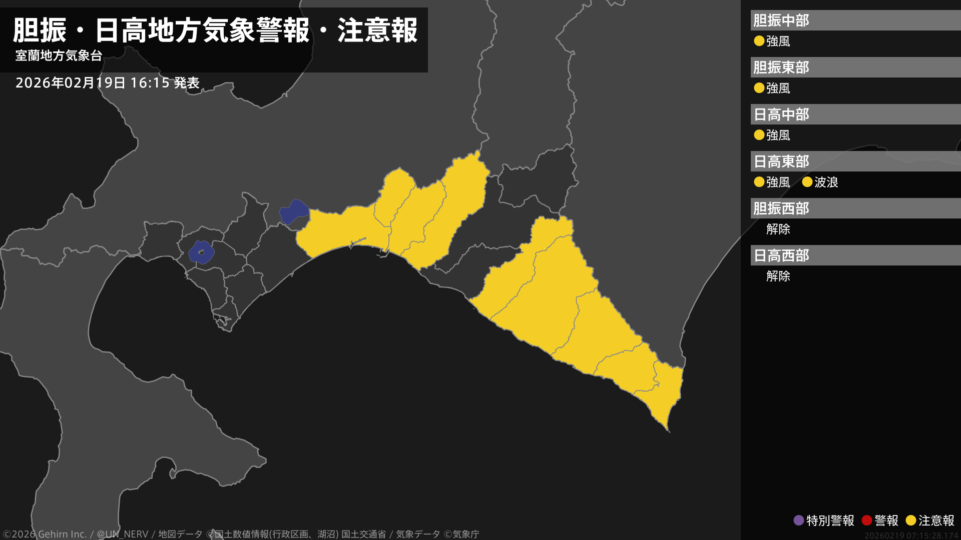 【胆振・日高地方 気象警報・注意報 2026年02月16日 00:09】日高地方では、16日明け方まで強風に注意してください。#気象警報注意報 #胆振地方 #日高地方