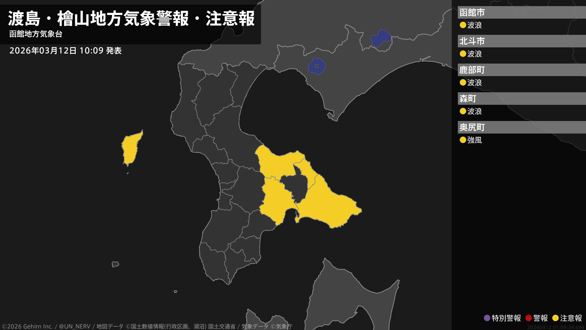 【渡島・檜山地方 気象警報・注意報 2026年03月12日 03:19】檜山地方では、12日朝から12日夜遅くまで強風に注意してください。渡島地方では、12日昼前から高波に注意してください。#気象警報注意報 #渡島地方 #檜山地方