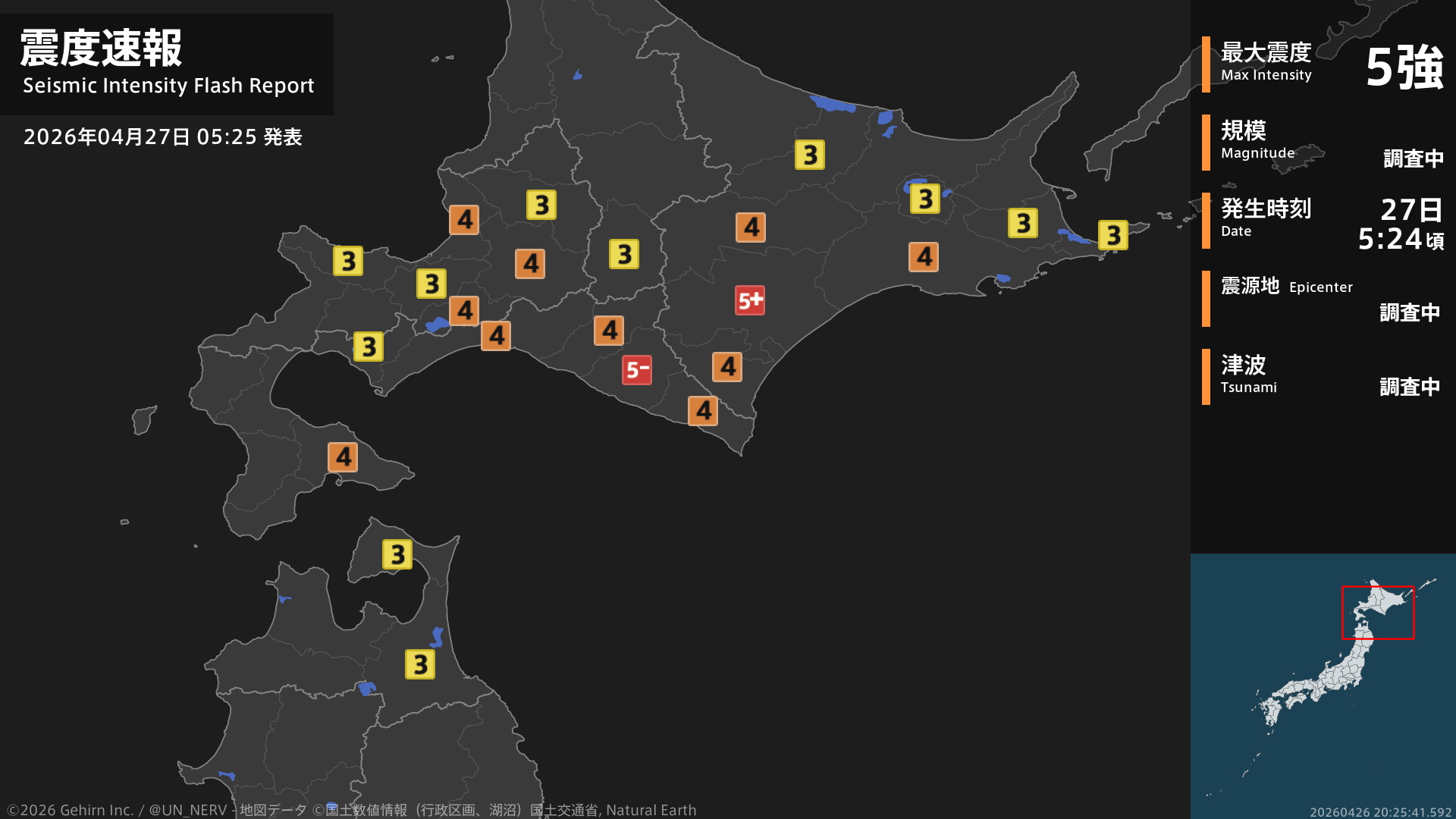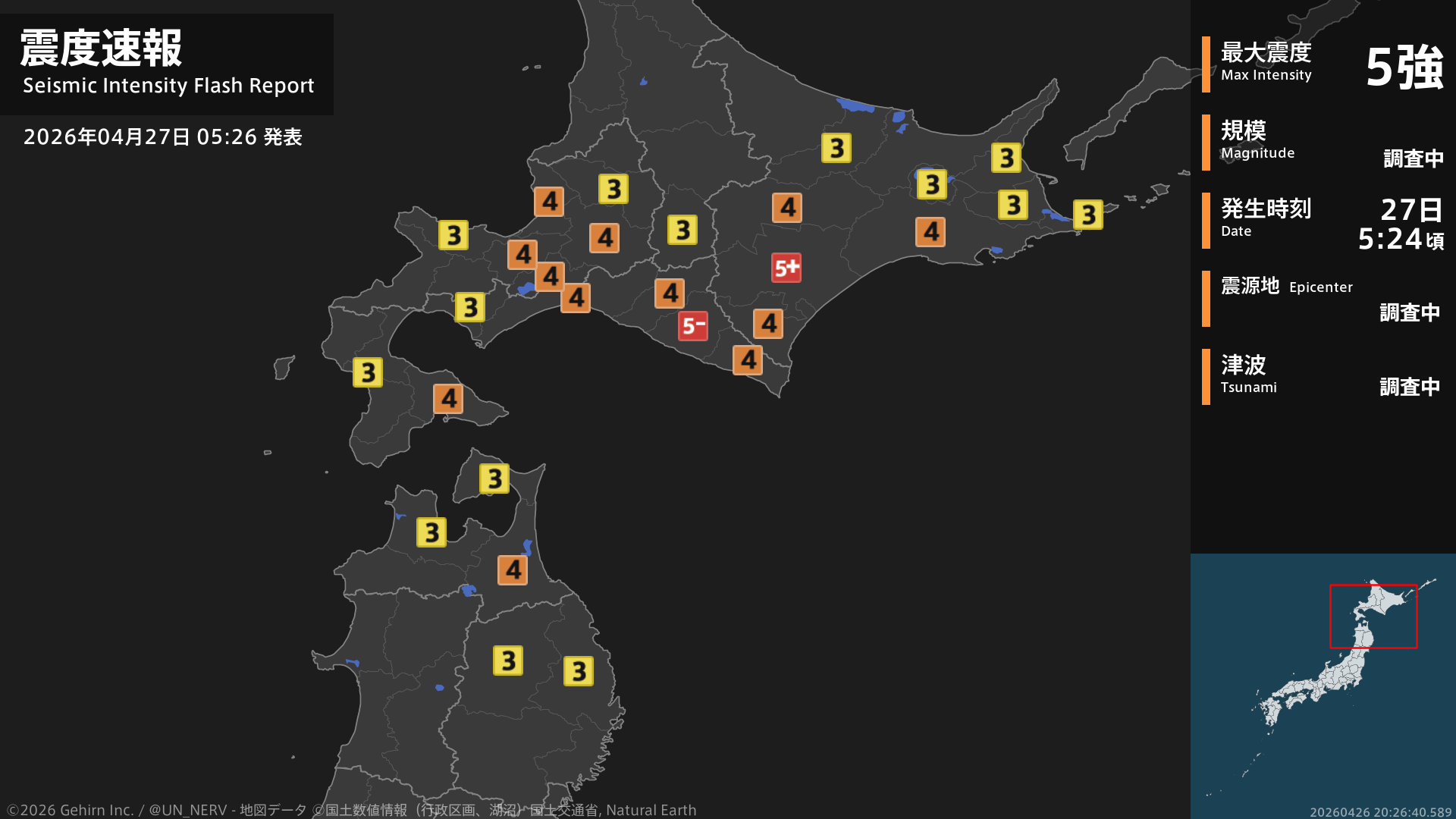 【緊急地震速報 第6報 2026年4月27日】5時24分頃、十勝地方南部を震源とする地震がありました。地震の規模はM5.6程度、最大震度4程度と推定されています。この情報は気象庁の予報に基づく推定です。情報は誤差を含む場合があります。#北海道道東 #北海道道南 #北海道道央 #緊急地震速報