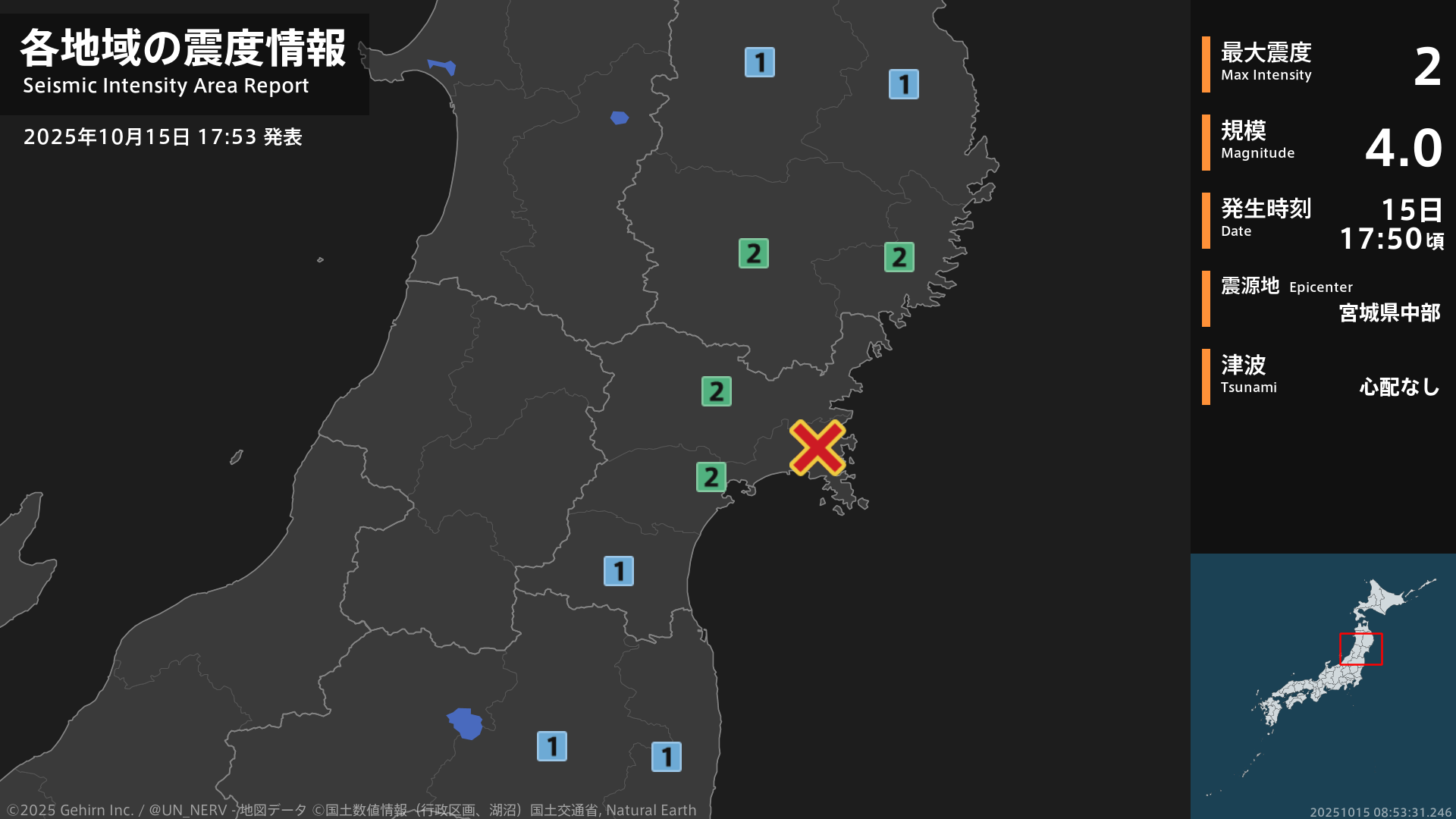 17時50分頃、宮城県中部を震源とする地震がありました。震源の深さは約70km、地震の規模はM4.0、最大震度2を岩手県、宮城県で観測しています。この地震による津波の心配はありません。