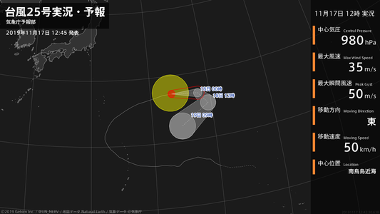 【台風25号実況・予報 2019年11月17日 12:42】強い台風25号(フンシェン)は、南鳥島近海を1時間に50キロの速さで東に進んでいます。#台風情報