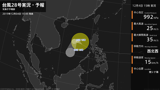 【台風28号実況・予報 2019年12月04日 15:41】台風28号(カンムリ)は、南シナ海を1時間に15キロの速さで西北西に進んでいます。#台風情報