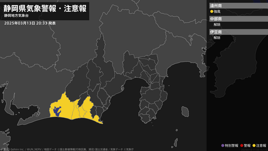 【静岡県 気象警報・注意報 2025年03月13日 20:33】西部では、強風に注意してください。#気象警報注意報 #静岡県