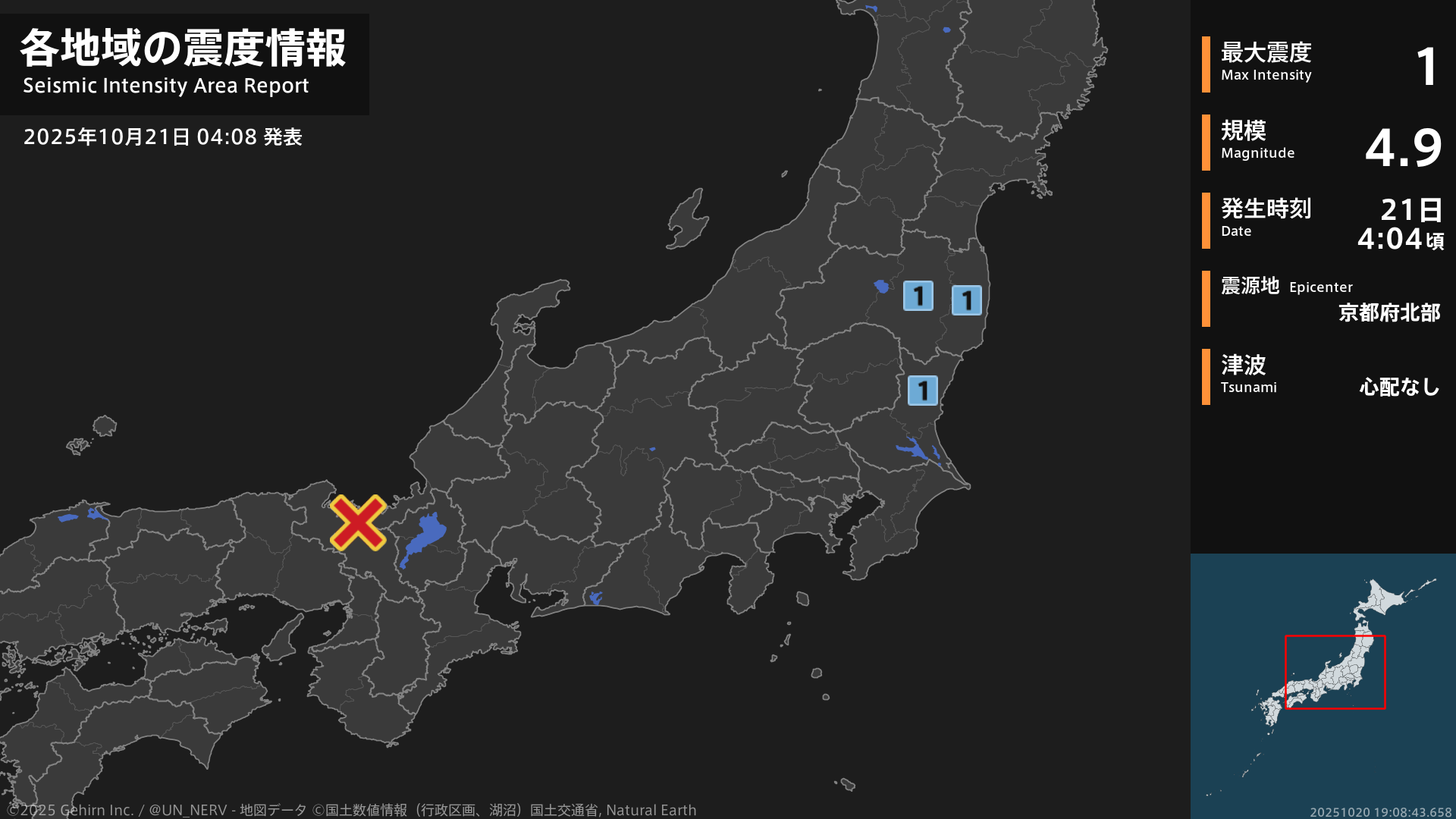 【地震情報 2025年10月21日】4時4分頃、京都府北部を震源とする地震がありました。震源の深さは約360km、地震の規模はM4.9、最大震度1を福島県、茨城県で観測しています。この地震による津波の心配はありません。#地震 #福島県 #茨城県