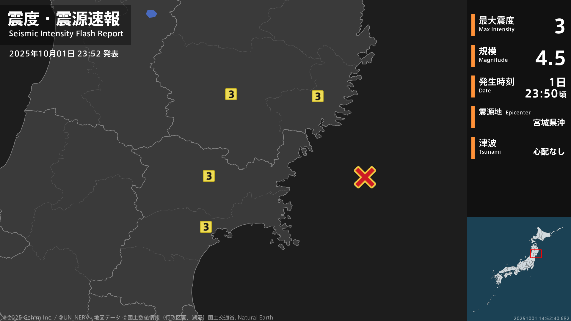 23時50分頃、宮城県沖を震源とする地震がありました。震源の深さは約60km、地震の規模はM4.5、最大震度3を岩手県、宮城県で観測しています。この地震による津波の心配はありません。